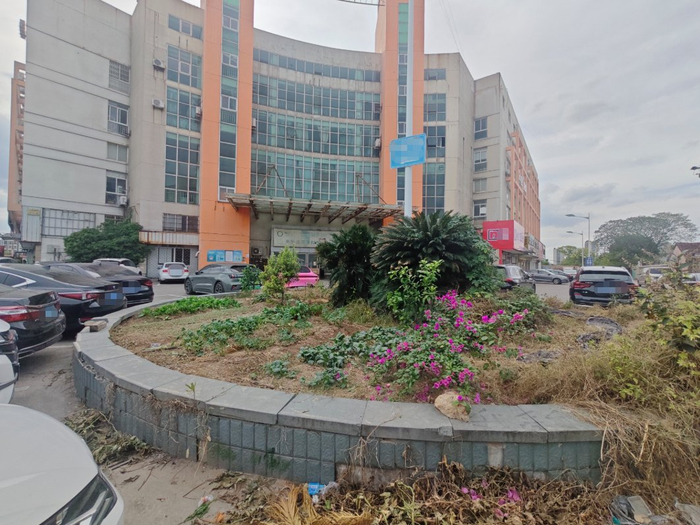 市场入口花坛内不见绿化,反而种满蔬菜,边缘残破,杂物随意丢弃。矮墙后更是堆积大量生活垃圾与工业垃圾,形成卫生死角。规划的草坪停车位杂草丛生,部分被垃圾占据,还有“僵尸车”长期停放。