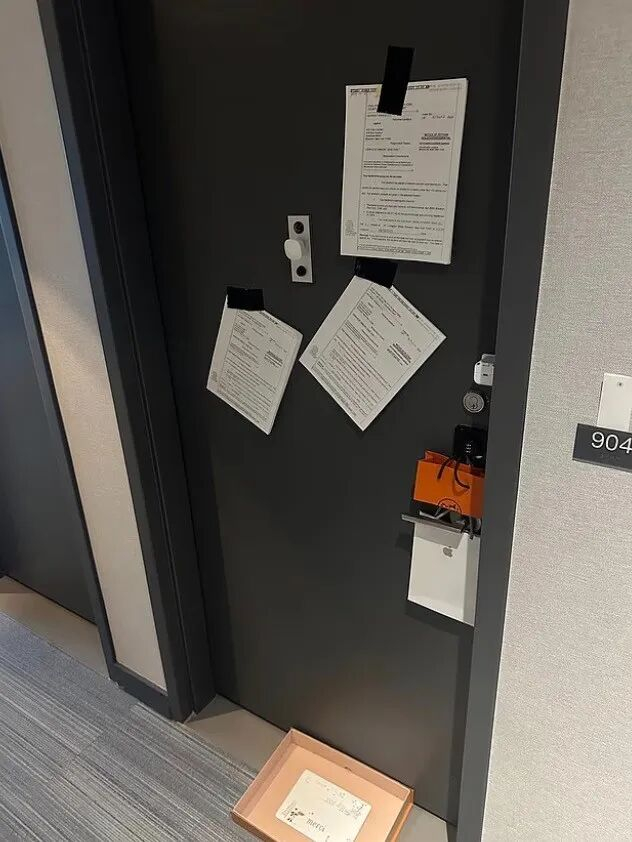 (钟佩公寓的门上贴满了驱逐通知)