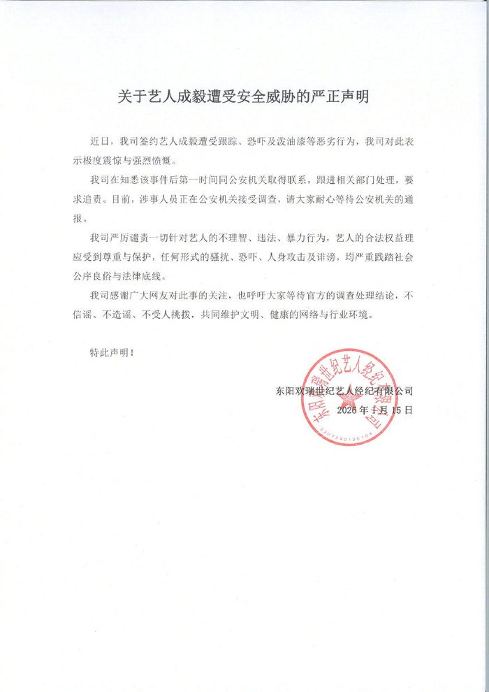 【经纪公司:#跟踪骚扰成毅涉事者正接受调查#】近日,演员@成毅 及家人遭个别人员持续跟踪骚扰一事,持续引发关注。1月15日,@欢瑞经纪 发布“关于艺人成毅遭受安全威胁的严正声明”:我司签约艺人成毅遭受跟踪、恐吓及泼油漆等恶劣行为,我司对此表示极度震惊与强烈愤慨。目前,涉事人员正在公安机关接受调查。